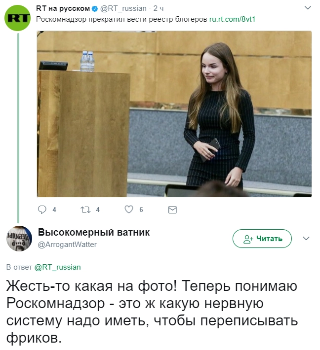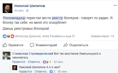 Дело в том, что сеть Интернет быстро эволюционирует, не всегда законы остаются такими же эффективными, какими они были в момент их принятия, и правоприменение доказывает, что законы требуют коррекции. Это относится и к одной из частей обсуждаемого законопроекта, и мы полностью поддерживаем отмену позиции в законодательство о реестре блогеров, заявлял недавно глава ведомства Александр Жаров.