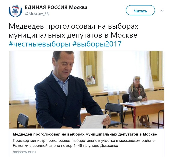 Премьер-министр Дмитрий Медведев и его супруга Светлана проголосовали на избирательном участке в московском районе Раменки в средней школе номер 1448 на улице Довженко.