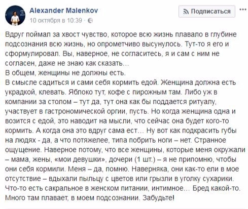 Главный редактор журнала Maxim Александр Маленков разместил в Facebook довольно опрометчивое высказывание, за которое и поплатился. Он заявил, что что «женщины не должны есть».