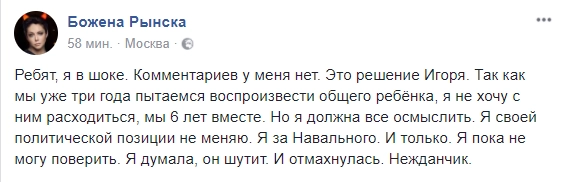 Малашенко — муж светской львицы Божены Рынски. Сама она призналась, что не ожидала такого от супруга.