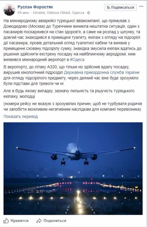 На своей странице в Facebook советник начальника ГУ Нацполиции Украины в Одесской области Руслан Форостяк рассказал о том, что во время полета один пассажир надолго заперся в туалете, сославшись на проблемы с желудком.