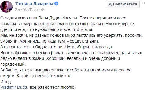 «Сегодня умер наш Вова Дуда. Инсульт. После операции и всех возможных мер, на которые были способны врачи в Новосибирске, сделали все, что нужно было, и все, что могли», — написала она.