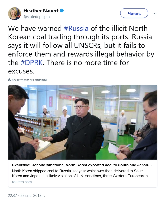 «Мы предупреждали Россию о незаконной торговле северокорейским углем через ее порты. Россия заявляет, что она будет следовать всем резолюциям Совета Безопасности ООН, но она не может обеспечить их соблюдение и поощряет незаконное поведение КНДР. Больше нет оправданий», — написала в своем микроблоге в Twitter представитель Госдепа Хизер Науэрт.