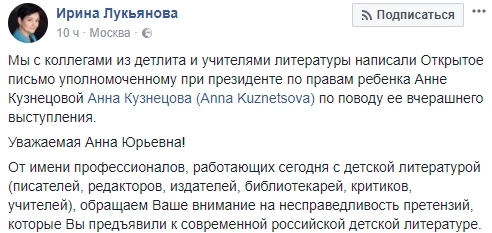 Внушительная группа писателей, редакторов, издателей, библиотекарей, критиков и учителей обратилась с открытым письмом к уполномоченному при президенте по правам ребенка Анне Кузнецовой в связи с ее критикой детских произведений. Текст послания был опубликован в Facebook.