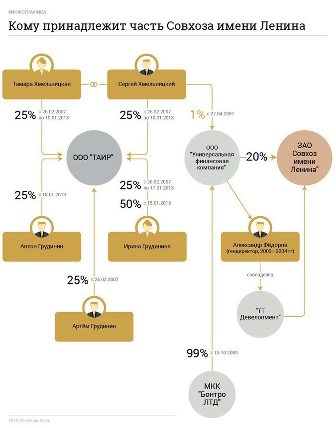 Как выяснил «Лайф», Грудинин прекрасно осведомлен, кто владеет пятой частью «Совхоза имени Ленина»: таинственным акционером является бизнесмен Сергей Хмельницкий, старый приятель Грудинина. «Он и его жена были деловыми партнерами супруги Грудинина по салону красоты „Таир“, поэтому знакомы уже более 10 лет. А бывший гендиректор той же компании и сейчас связан со строительной фирмой Грудининых „ТТ Девелопмент“», — пишут корреспонденты издания.