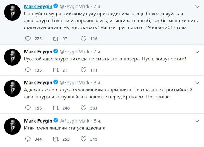 Сам бывший адвокат прокомментировал решение Адвокатской палаты в свойственной себе резкой манере. «Адвокатского статуса меня лишили за три твита. Чего ждать от российской адвокатуры, изогнувшейся в поклоне перед Кремлем! Позорище. Русской адвокатуре никогда не смыть этого позора. Пусть живут с этим!» — написал Фейгин в Twitter.