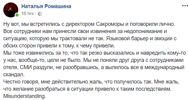 Вот так. Инициатор всей этой истории Наталья Ромашина вечером в четверг опубликовала в своем Facebook «итоговое коммюнике», в котором сообщает, что конфликт, возникший с «фашиствующим» персоналом гостиницы Sacramoro (где ее кормили отдельно от европейских туристов), турфирмой «Библио-Глобус» (которая продала ей тур по системе Fortuna, то есть без гарантии заселения в конкретный отель), представителем принимающей стороны Александром Смаглым и итальянским народом в целом, исчерпан.