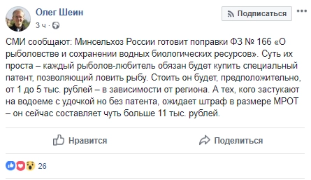 Минсельхоз России готовит поправки ФЗ № 166 «О рыболовстве и сохранении водных биологических ресурсов». Суть их проста — каждый рыболов-любитель обязан будет купить специальный патент, позволяющий ловить рыбу. Стоить он будет, предположительно, от 1 до 5 тысяч рублей — в зависимости от региона. А тех, кого застукают на водоеме с удочкой, но без патента, ожидает штраф в размере МРОТ — он сейчас составляет чуть больше 11 тыс. рублей, — сообщил парламентарий на своей странице в Facebook со ссылкой на некие СМИ.