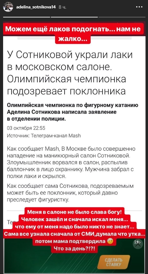 Меня в салоне не было, слава Богу! Человек зашел и сначала искал меня… Что ему от меня надо было, никто не знает… Сама все узнала сначала от СМИ, думала, что утка… Потом мама подтвердила. Что за день?! — написала 22-летняя спортсменка.