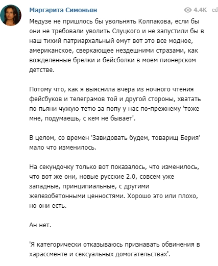 Ан нет, добавила журналистка. И привела слова ушедшего в отставку главного редактора «Медузы», заявившего, что он категорически отказывается «признавать обвинения в харассменте и сексуальных домогательствах».