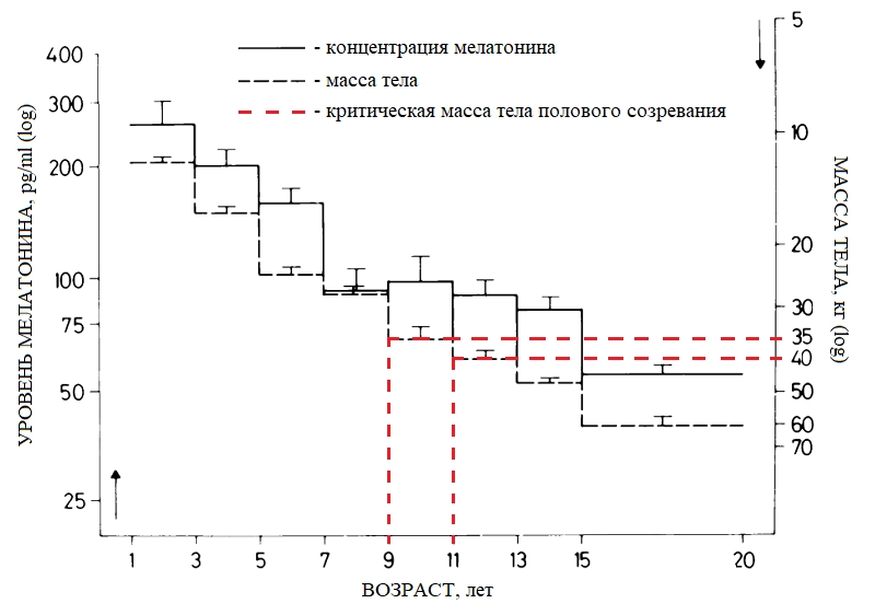 В раннем детстве высокая концентрация мелатонина блокирует гормоны гипофиза, стимулирующие половые железы (гипофизарно-гонадная система). С возрастом уровень мелатонина в организме ребенка снижается, что и обуславливает активацию гипофизарно-гонадной системы и запуск полового созревания. Данная роль мелатонина в половом созревании доказана в исследованиях более полувека назад. Подробнее о роли мелатонина в профилактике старения и рака я писал здесь, а сейчас актуален вопрос — как увеличение массы тела становится причиной снижения уровня мелатонина и наступления полового созревания.
