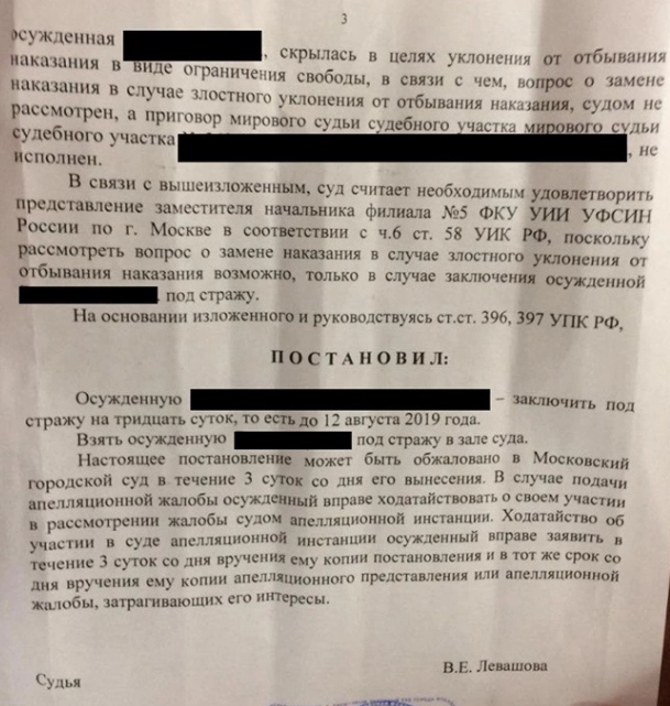 Ее, естественно, никто об этом не уведомлял, потому что в Краснодарском крае ее не могли найти, как пишет сам Краснодарский ФСИН. То есть это вообще должен был делать московский ФСИН, а не краснодарский. То есть определение о замене штрафа на ограничение свободы вынесено незаконно, на основании представления ненадлежащего органа, — подчеркнул Джулай.
