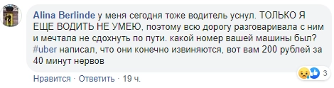 У Безсудовой возникло было подозрение, что ее водитель выпил или принял наркотики. Но комментаторы в Facebook, сталкивавшиеся с подобными ситуациями, считают, что шоферы, работающие с «Яндекс.Такси», Uber и другими агрегаторами, в основном от переработки — бывает, что человек провел за рулем 12−16 часов. А явление это нередкое.