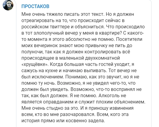 В Twitter также прозвучало несколько упреков в неподобающем поведении. Я принимаю эти упреки. Я хочу попросить прощения у всех девушек, которых обижал, которым мое поведение показалось оскорбительным. Я искренне раскаиваюсь в том, что я так себя вел с вами. Я никогда не хотел никого обидеть или оскорбить. Проблема была в неумении строить уважительные и равные коммуникации, — объяснил свое поведение Простаков.