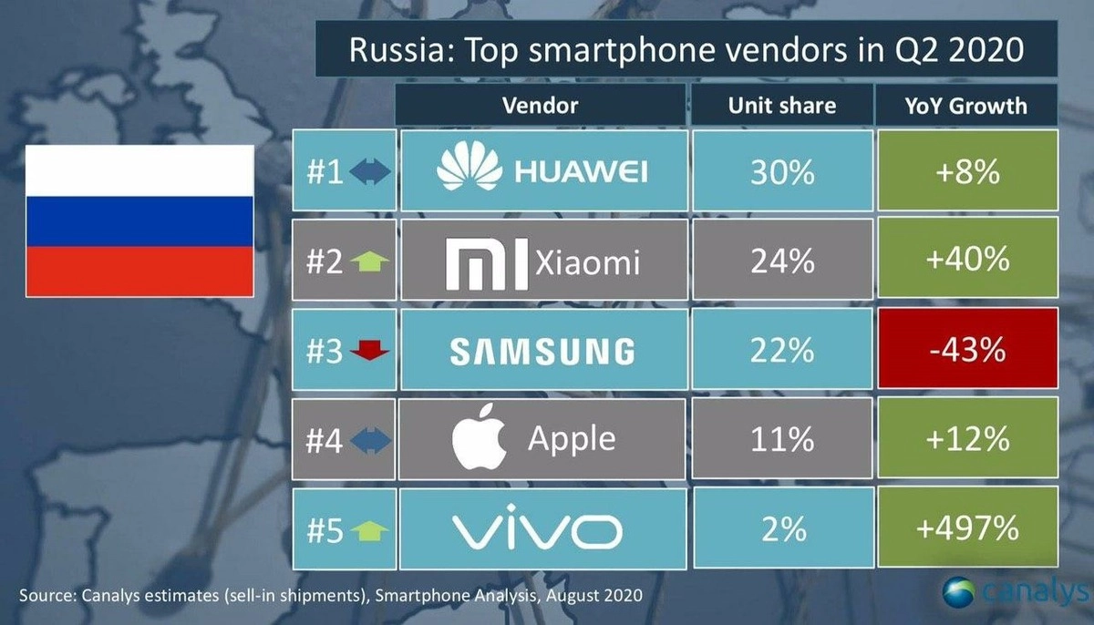 Наибольшую популярность в России снискал Huawei, который занял 30% рынка. На втором месте рейтинга разместилась китайская компания Xiaomi, которая улучшила свой показатель и заняла 24% рынка. Xiaomi смогла добиться этого за счет увеличения продаж на 40%. Замыкает тройку лидеров южнокорейский гигант Samsung, который опустился на одну строчку в рейтинге и занял 22% рынка.