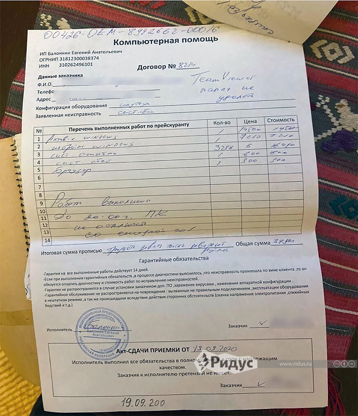 «Ридус» созвонился с мастером Александром, который оказывал услуги женщине. Он сказал, что они с другом, на которого и оформлено их ИП, они занимаются оказанием помощи с домашними компьютерами уже долгое время и прекращать не собираются. Никаких мошеннических мотивов, по его словам, у них нет.