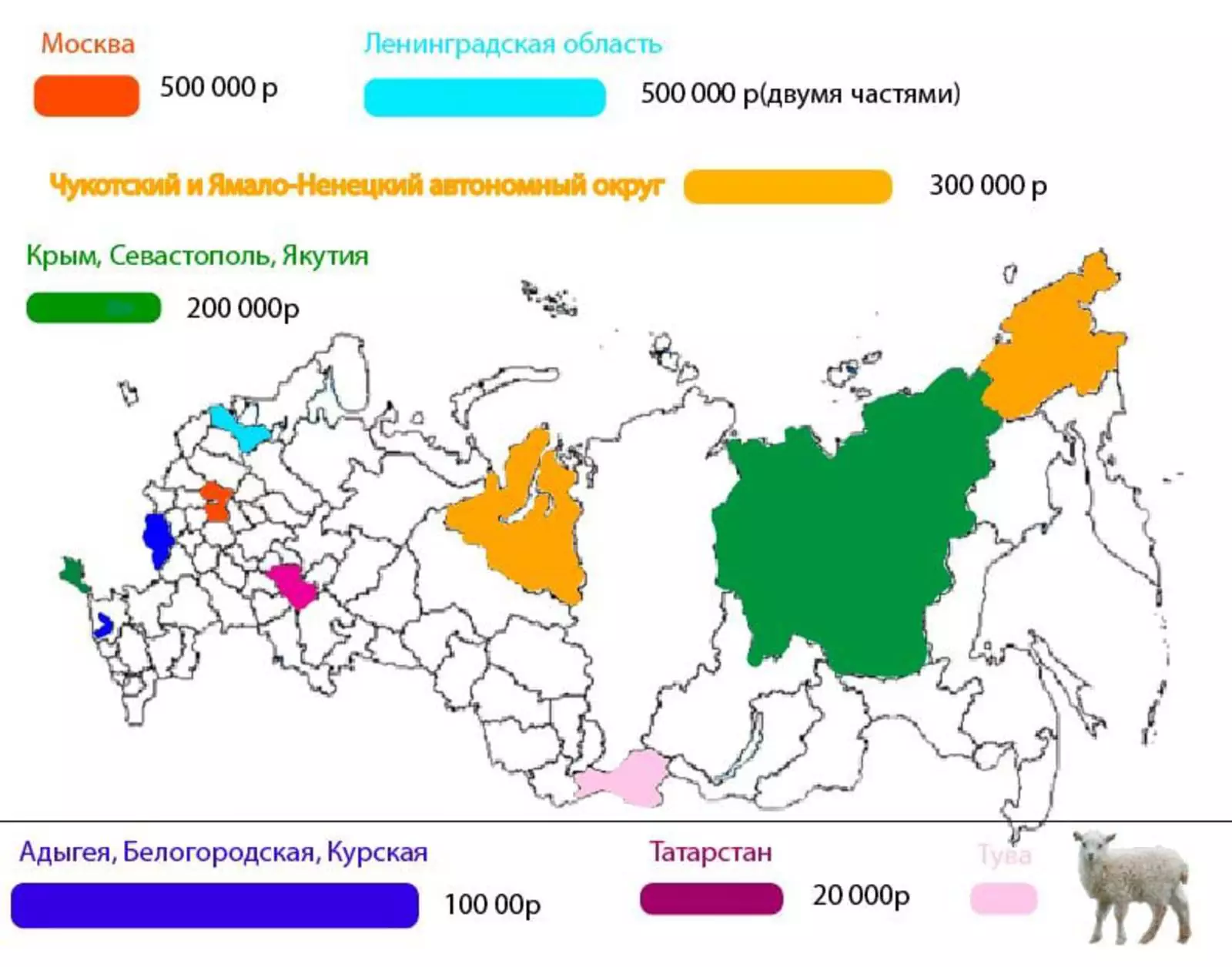 Главным аутсайдером выступила Тува: здесь семьям мобилизованных пообещали выдать по барану. Кроме того, в некоторых районах семьям выдавали муку, картофель и капусту, отгружали дрова и уголь.