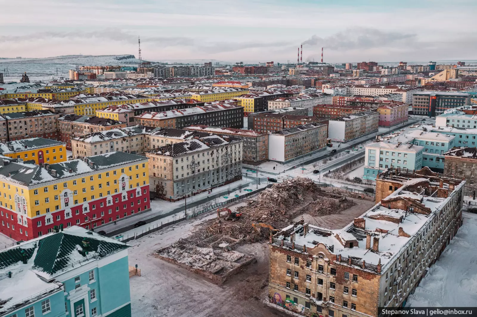 41. Некоторые дома в Норильске расселяют и демонтируют. Расселение не относится к теме заброшенных посёлков Севера, которые остаются после закрытия шахт, в Норильске это плановая работа по обновлению жилого фонда. Население здесь растёт примерно на 1000 человек в год.