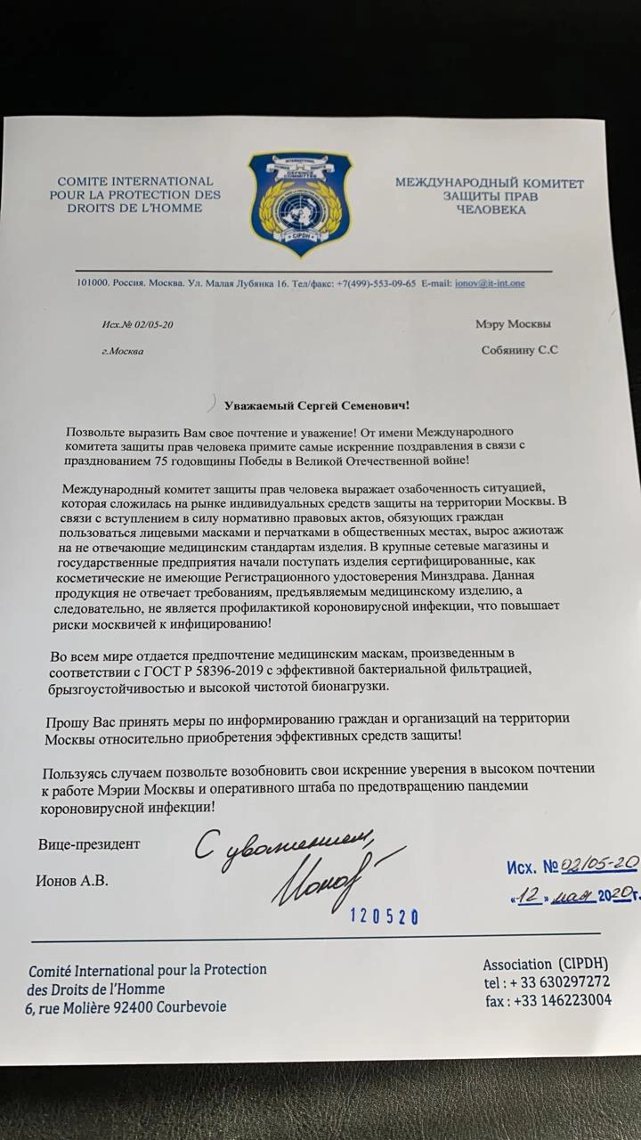 Вице-президент международного комитета защиты прав человека Александр Ионов обратился к мэру Москвы Сергею Собянину с просьбой навести порядок в продаже масок. По его мнению, мэрия обязана информировать москвичей о том, что не все маски могут эффективно защищать от инфекции.