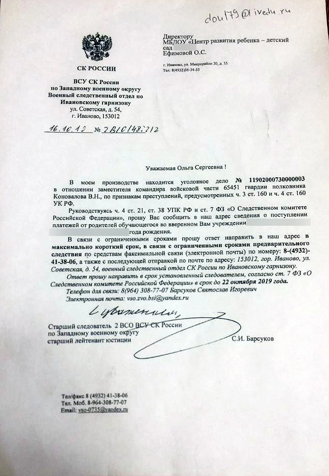 Она также рассказала, что следователь пытался выяснить, оплачивают ли Коноваловы учебу своих детей в государственных учреждениях, и даже писал туда письма. «Следователь направил письма в детский садик ребенка и в Суворовское училище с просьбой сообщить, какую сумму мы платим за учебу детей. Но это же государственные учреждения, и все знают, что в садик платят минимум, а в Суворовское — вообще ничего», — продолжает жена Коновалова. Она записала видеообращение, которое попросила разместить в Сети. В нем она обращается ко всем причастным к этой истории и просит честного следствия и суда. Она не требует выпустить мужа немедленно, но просит честно разобраться в этой истории. И еще говорит, что, если удастся доказать его невиновность, может, срок и не дадут, с учетом того, сколько он уже находится в СИЗО, но могут лишить всего, что он заработал за 27 лет службы Родине — награды, звание, заслуги.