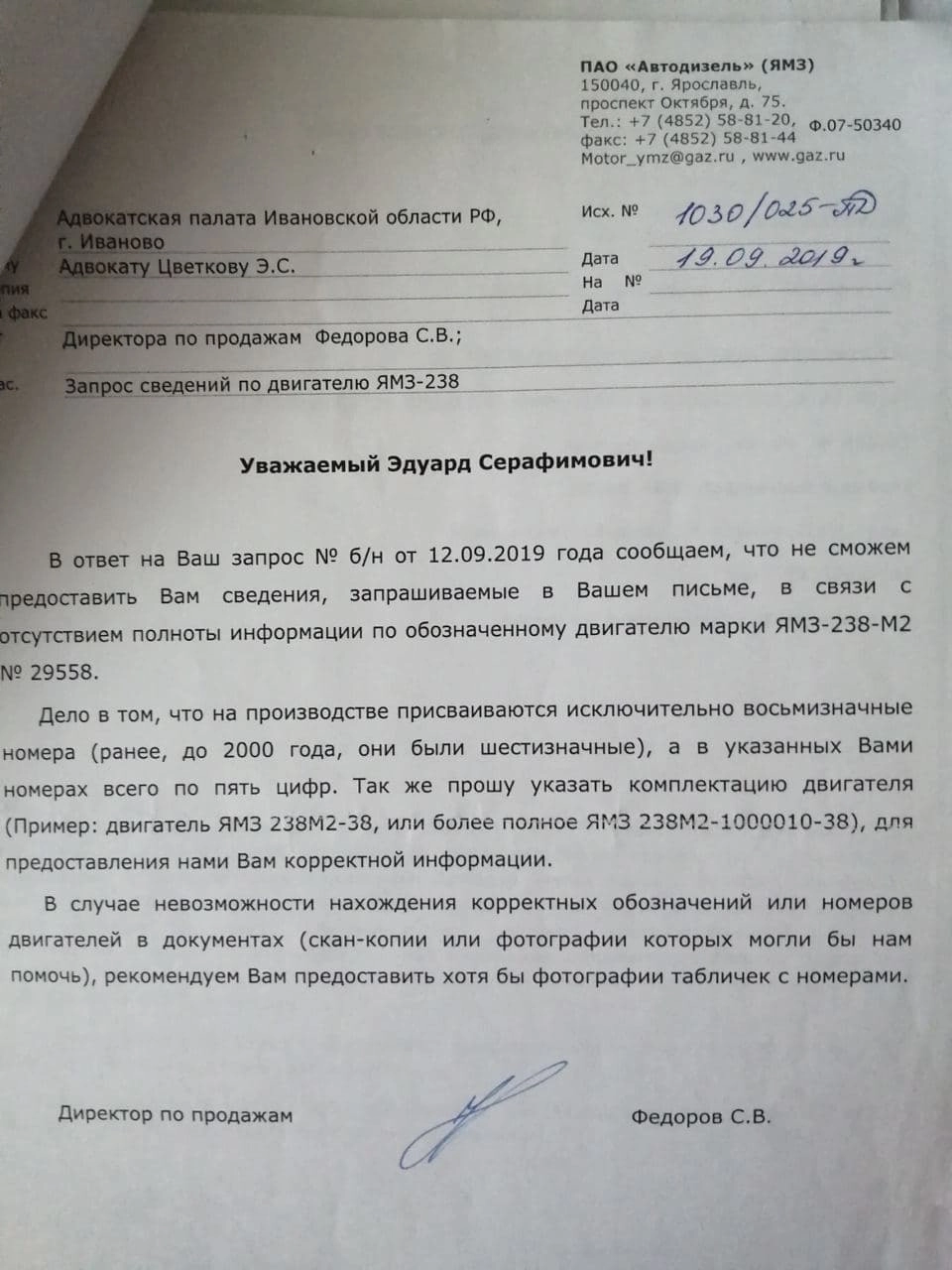 «Я запрашивал заводы — Ярославский и Камский, такие двигатели просто не выпускались. Мало того, реальные номера двигателей, которые выпускают эти заводы, не соответствуют тем, которые указаны в протоколе, поскольку они намного длиннее и имеют не только цифры, но и буквенные значения», — продолжает адвокат.