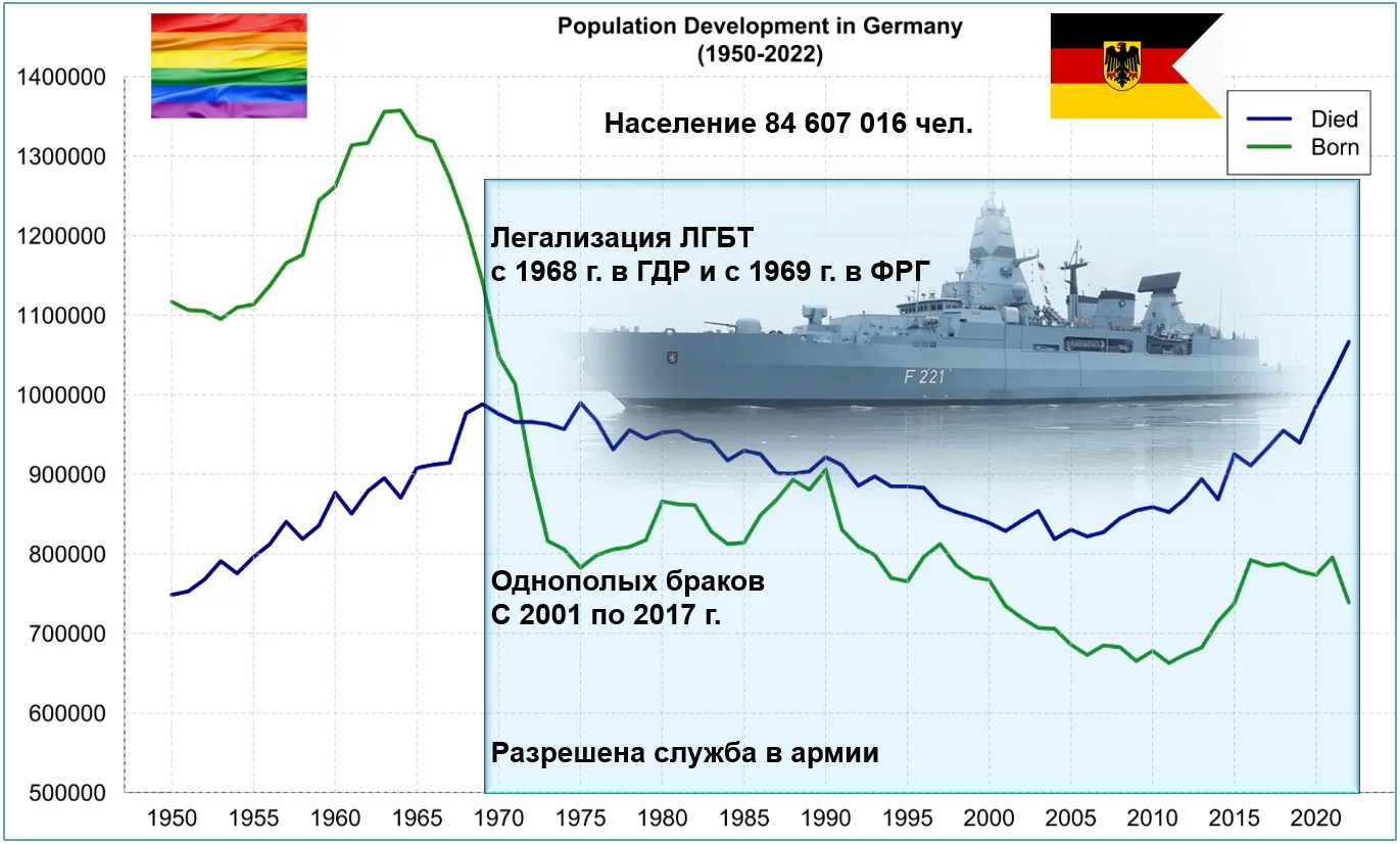 В результате пришлось разобраться с некоторыми тонкостями демографии западного мира. Полученные результаты откровенно удивили. Оказывается, население ФРГ и ГДР, вместе взятых, в начале 70-х годов прошлого века достигло демографического креста, когда смертность стала выше рождаемости. Изменению этого процесса в лучшую сторону не помогло даже их объединение.