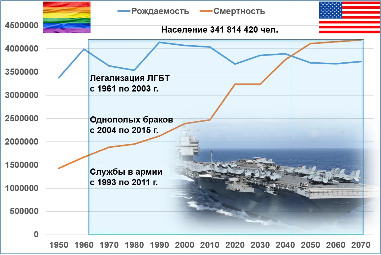 А в итоге получается, что если и читать западную прессу, то не только заголовки статей и однобокие мнения. Надо тянуть за ниточку, чтобы понять полноту озабоченности о ВМС НАТО и не только. Кстати, если уж зашёл такой разговор, то США в ЛГБТ*-сообществе занимает одно из ведущих мест в мире (первое — у Канады). Рождаемость не растёт, а смертность прогрессирует.