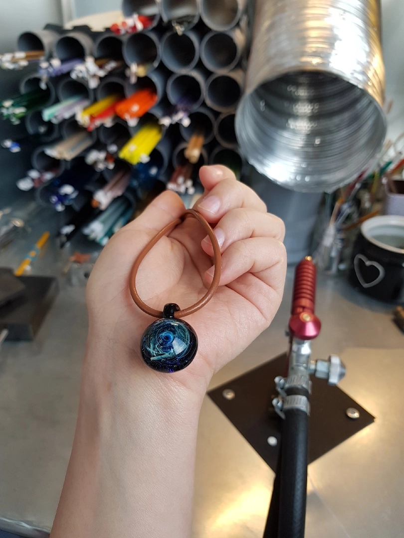 «Моей любимой работой, пожалуй, является кулон-галактика. Я ездила на мастер-класс, с которого увезла три работы. Это вот одна из них. Ношу ее сама, это мой талисман».