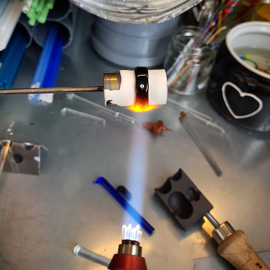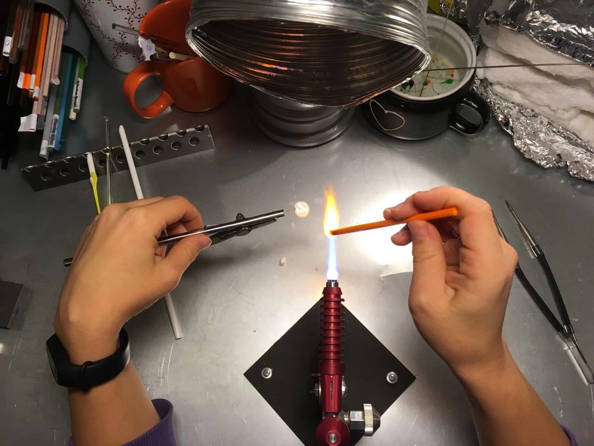 «Температура пламени горелки может достигать 1200 °C, стеклянные палочки плавятся и становятся мягкими, как карамель. И вот эту карамель можно наматывать на спицы — так получаются бусины. После того, как работа над бусиной закончена, я кладу ее в керамическое одеяло. Это нужно для того, чтобы стекло остывало постепенно, так как иначе оно треснет. После остывания, что обычно занимает часа два, я снимаю бусину со спицы и откладываю. Накопив некоторое количество стекляшек, отправляю их в муфельную печь на отжиг, чтобы выровнять внутреннее напряжение».