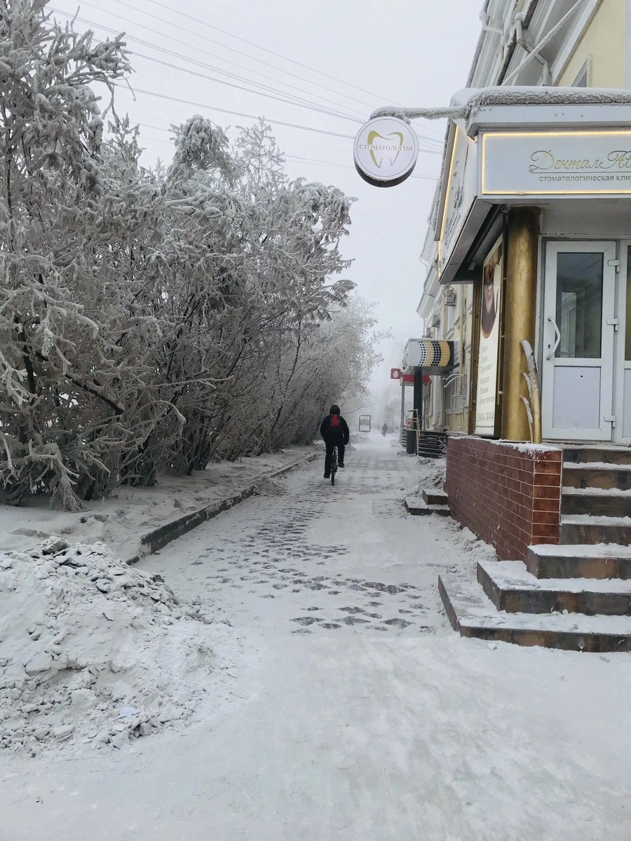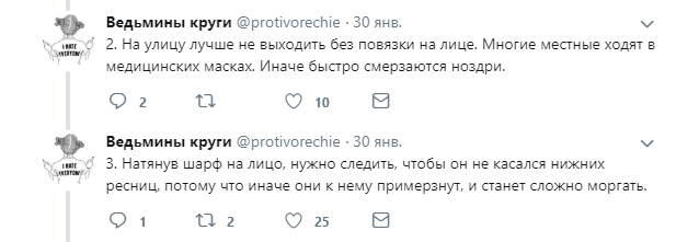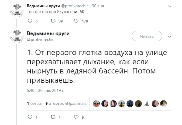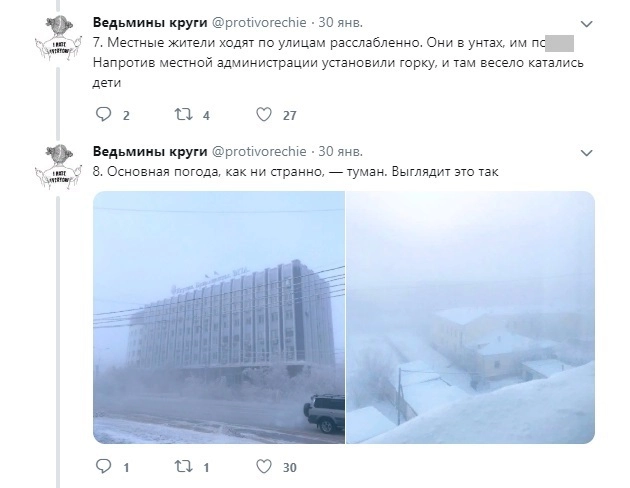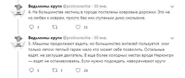 Автор микроблога с ником protivorechie съездила в командировку в один из самых холодных городов России — Якутск — и поделилась своими впечатлениями с подписчиками в Twitter. Известно, что в Якутии температура воздуха может опускаться до -65, но девушке повезло, и она гуляла по морозным улицам всего-то в -50. Путешественницу удивило, что там тоже купаются в проруби, на лестницах лежат ковры, а ещё отметила, что ресницы могут примёрзнуть к шарфу, если обмотать им всё лицо.