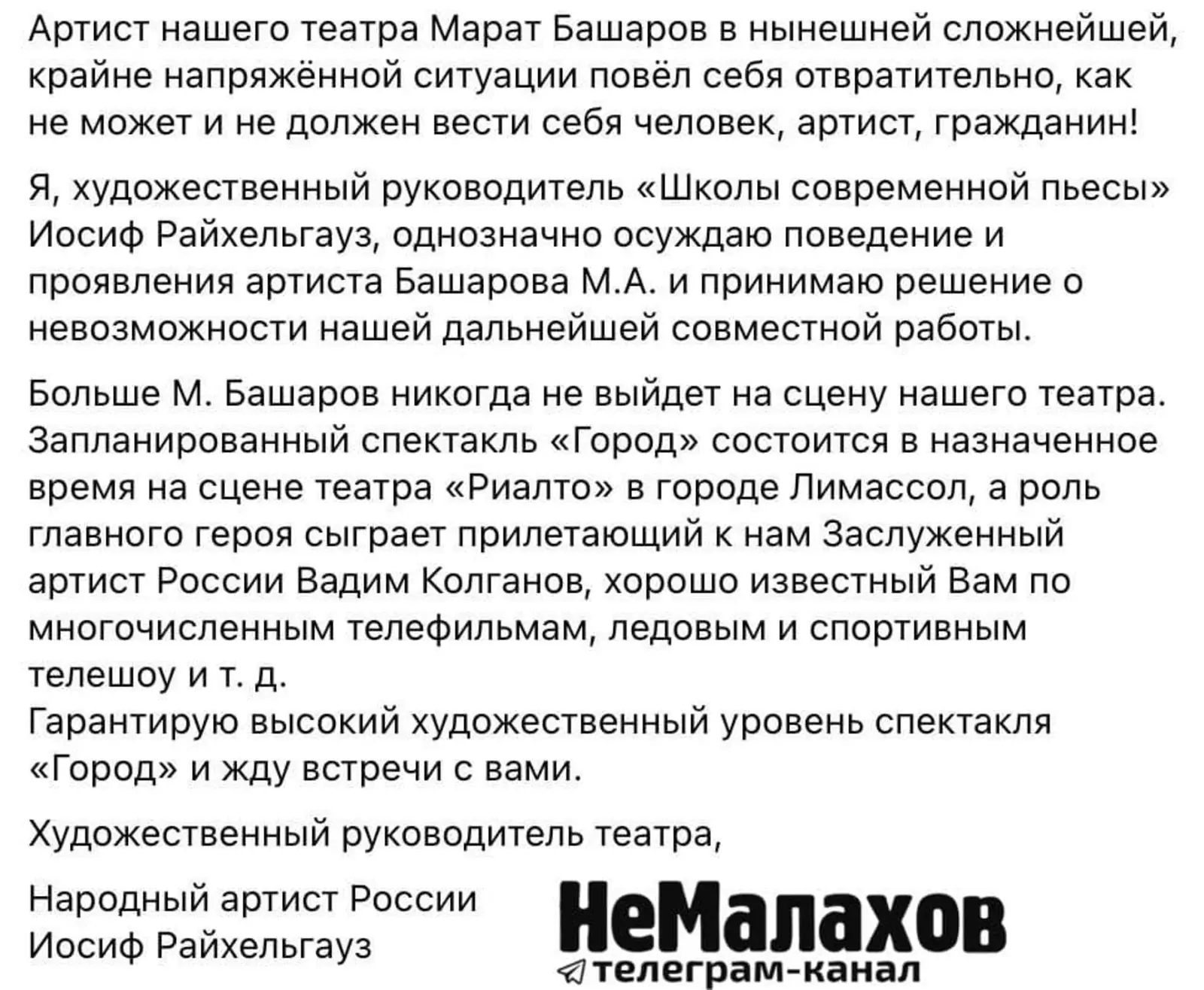 Ранее Telegram-канал «НеМалахов» опубликовал сообщение Иосифа Райхельгауза дирекции фестиваля «Пять вечеров», в котором режиссер объявил, что Башаров «в нынешней сложнейшей, напряженной ситуации повел себя отвратительно, как не должен себя вести артист, человек, гражданин».