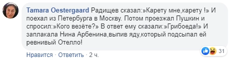 Пользователи Сети не смогли «пройти без шуток» мимо оговорки, которую региональный министр так и не заметила. Некоторые комментаторы даже попытались развить сюжет кроссовера грибоедовского «Горя от ума» и радищевского «Путешествия из Петербурга в Москву», добавив туда других классических авторов и их персонажей.