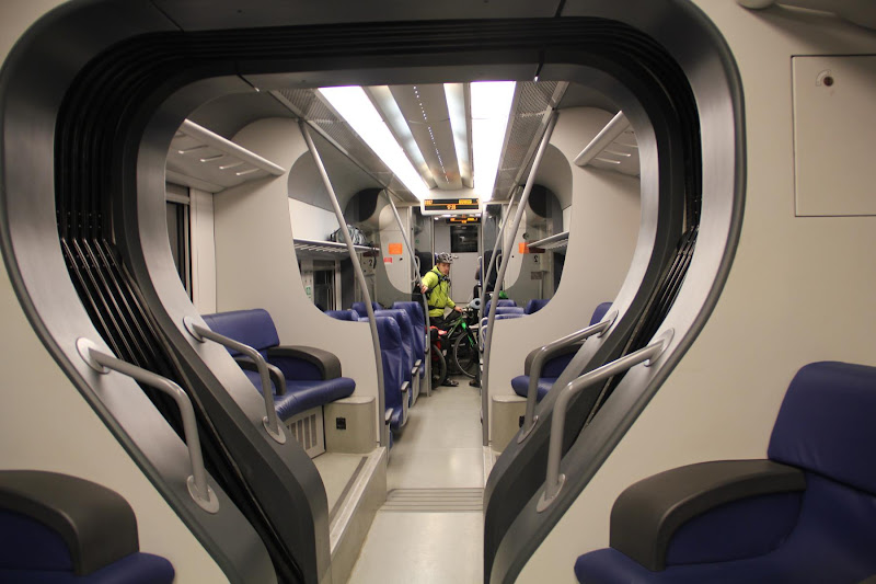 Кроме того, в вагонах часть мест - откидные, и на такое место можно, к примеру, заехать и встать инвалидной коляской. А вот для велосипедов ни мест, ни приспособлений крепления я не увидел. Видимо, в этой комплектации не предусмотрено.