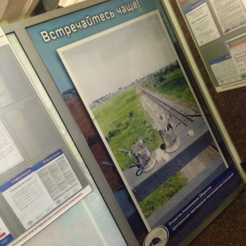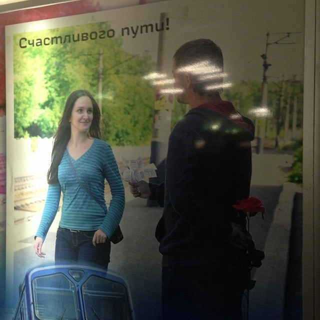 Итак, Казанский вокзал. Только у меня возникает вполне логичный вопрос об адекватности этого фото, точнее, сценки на нем изображенной? Дарить билеты вместо цветов? И то, что столбы не догадались очистить от рекламы. Да и вообще, прямо скажем, это была не лучшая платформа для фотосессии....