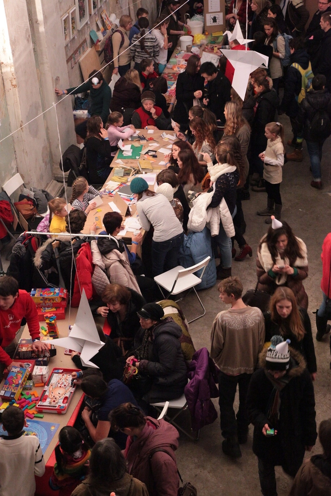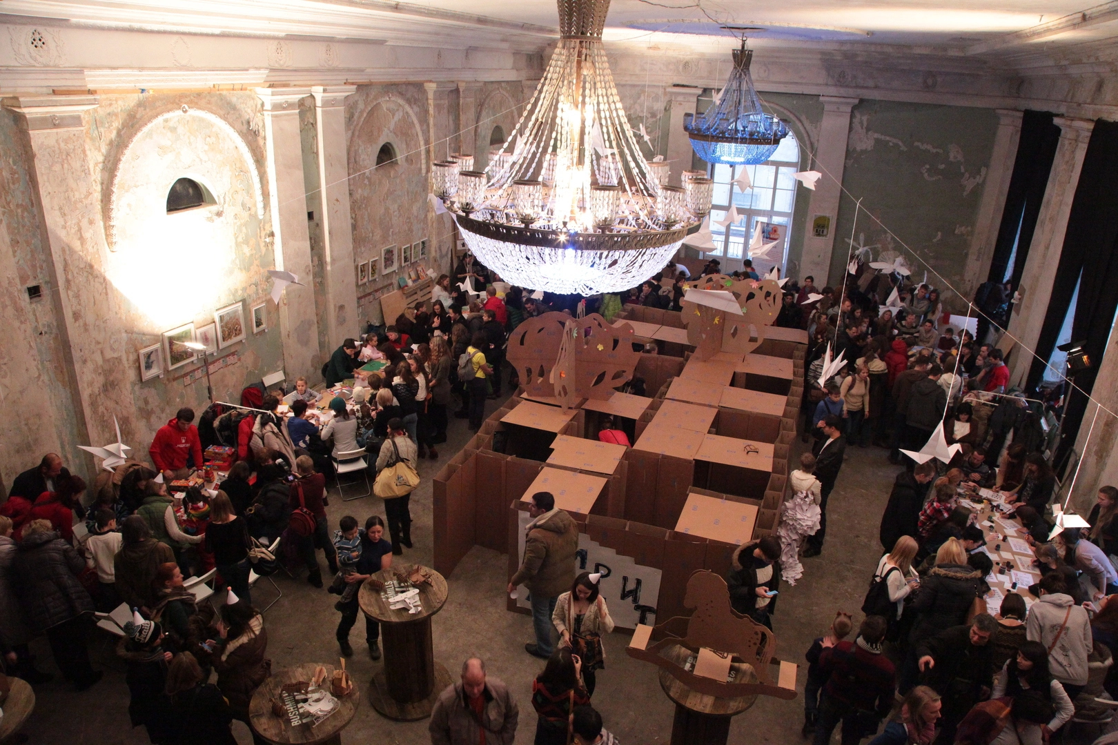 В первый день зимы большой зал с люстрами и колоннами на втором этаже превратился в сказочное царство бумаги, смеха, веселья и радости. Ранее заброшенный особняк был открыт в октябре 2012 года и является местом обитания различных студий, шоу-румов, мастерских. Здесь проходят концерты, маркеты, арт-терапии, презентации и вечеринки.