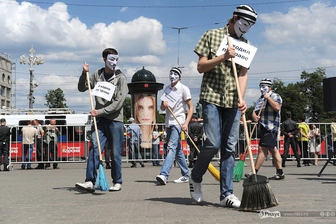 Развлекали пришедших театрализованным представлением с участием людей в масках Гая Фокса и тюремных робах, которые мели улицы под марши эпохи Третьего рейха. Действо символизировало возможное будущее протестующих в случае принятия Госдумой нового закона о митингах.