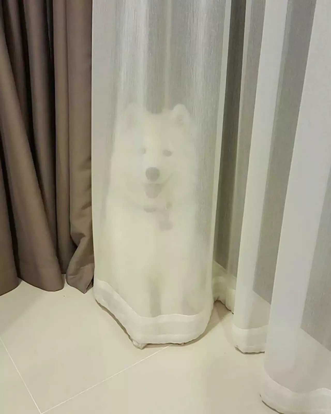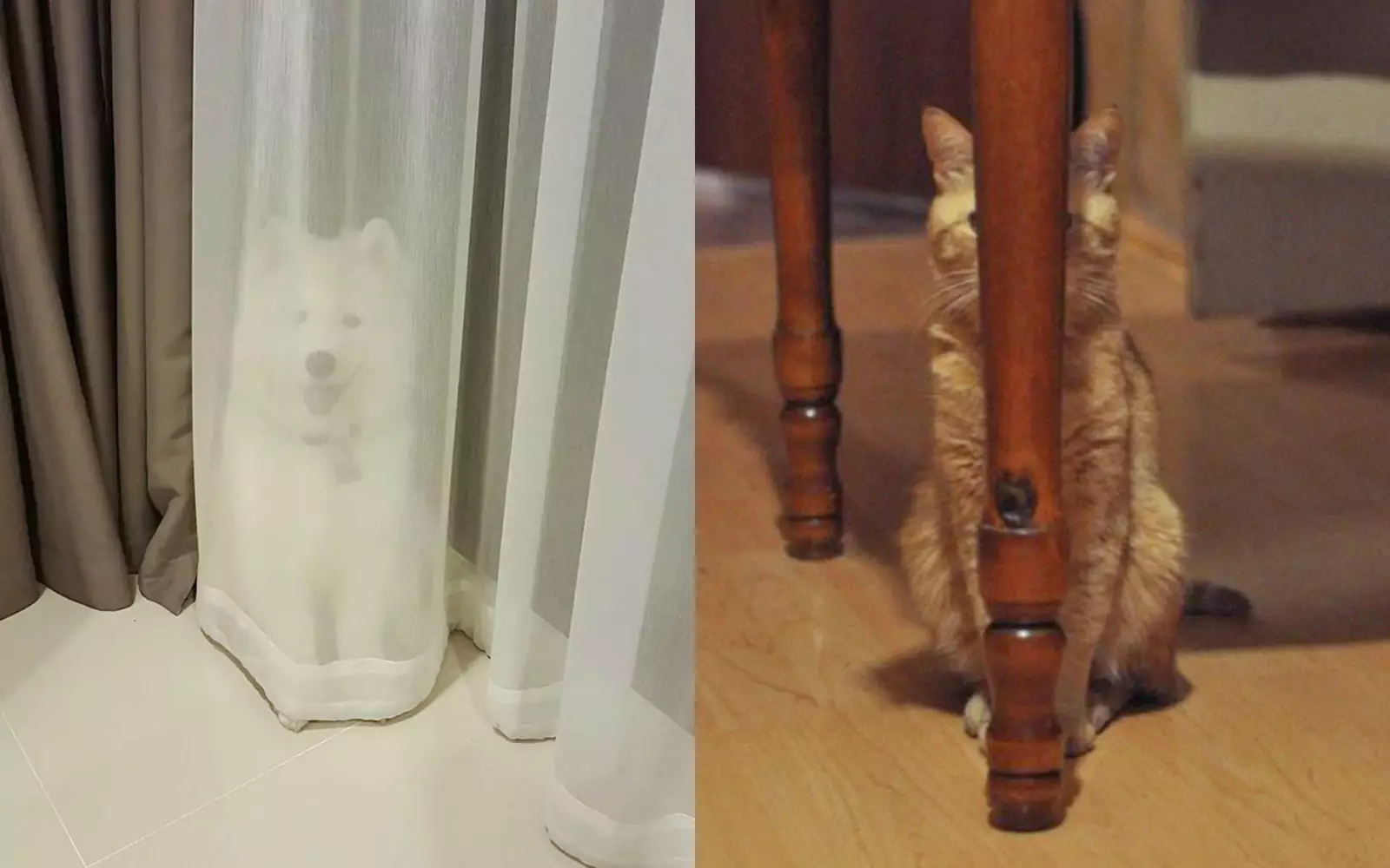 Домашние животные, как и маленькие дети, обожают играть в прятки и используют для этого любые предметы, даже самые неподходящие. Иногда собаки и кошки прячутся на самом видном месте, но хозяева все равно притворяются, что не замечают своих питомцев.