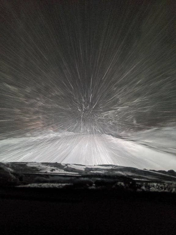 Фото, сделанное из машины во время метели, больше напоминает на снимок из летящего со сверхскоростью космического корабля