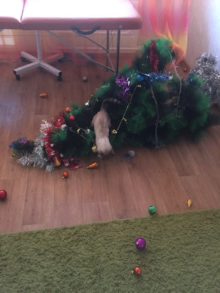 Всем давно известно, что любая кошка за свою жизнь должна сделать три вещи: перегрызть провод, пометить тапки и свалить елку. Поэтому самые продвинутые хозяева уже давно придумали лайфхаки для защиты новогоднего дерева в этот день. А вот люди из нашей подборки понадеялись, что их питомцы пощадят елку, и очень сильно об этом пожалели