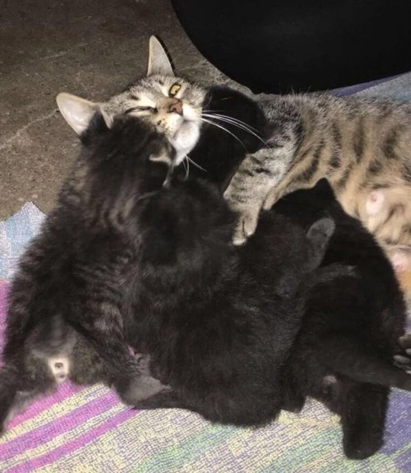 Кошка, которая выкармливает своего котенка и двух уличных.