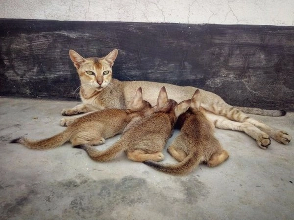 Кошка, которая выкармливает своего котенка и двух уличных.
