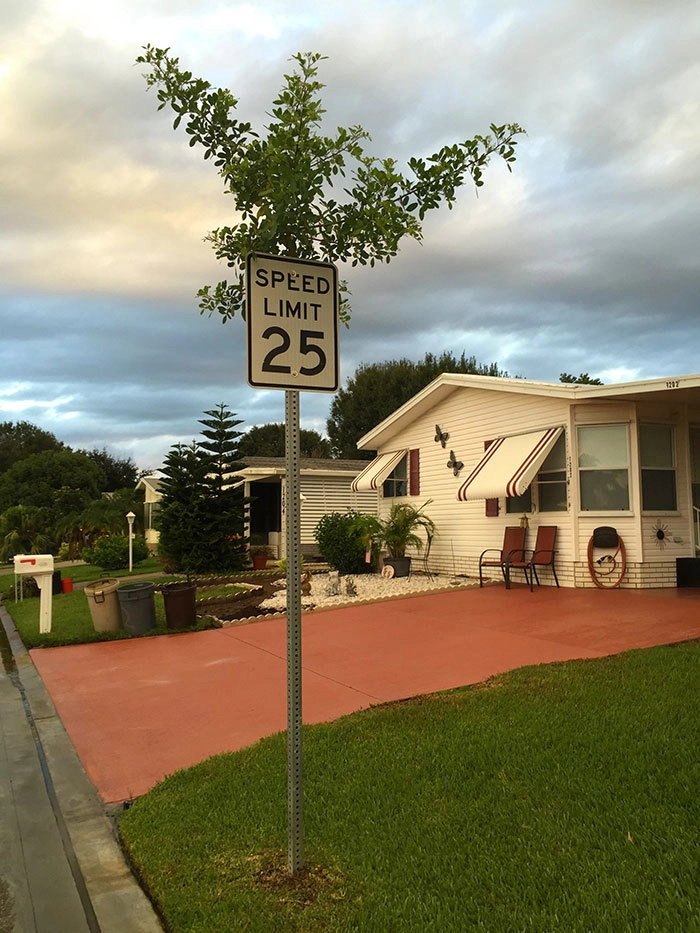 28. «Иногда деревья вырастают прямо из дорожных знаков, постепенно поглощая их»