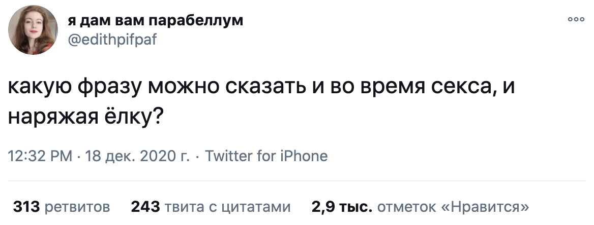 Пользовательница Twitter с ником @edithpifpaf опубликовала интересный тред на тему того, какая бы фраза была применима и во время украшения праздничной елки, и во время секса. Пользователи активно подхватили тему и накидали много интересных вариантов.