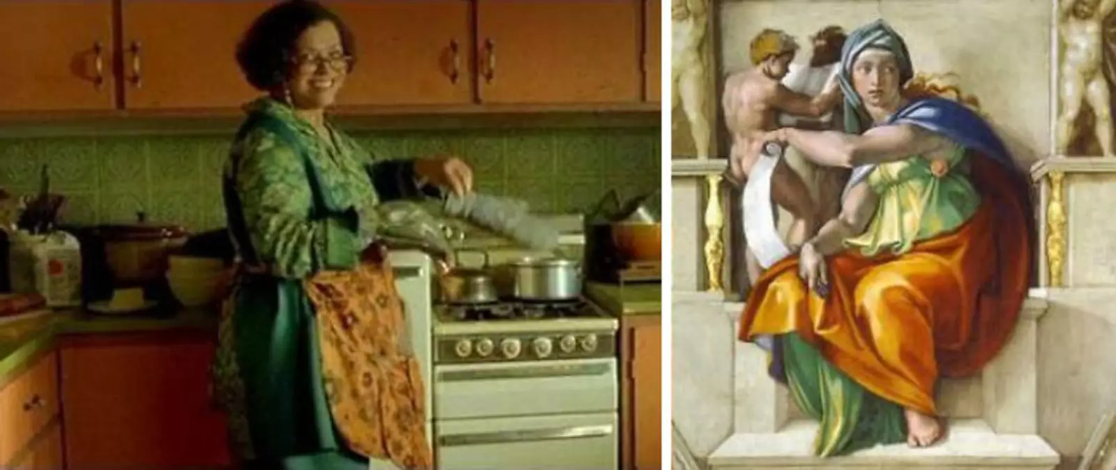 В «Матрице» наряд и цвет кухни оракула является отсылкой к фреске Микеланджело, на которой изображена фигура греческой провидицы.