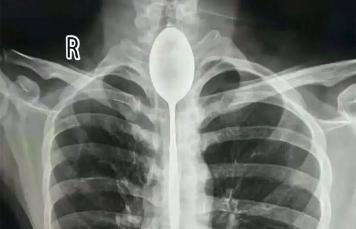 Снимок человека, у которого в пищеводе застряла стальная ложка