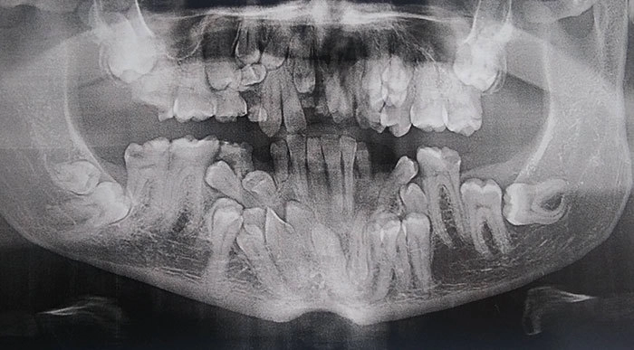 Снимок челюсти человека с клидокраниальным дизотозом (избыточное количество молочных или постоянных зубов)