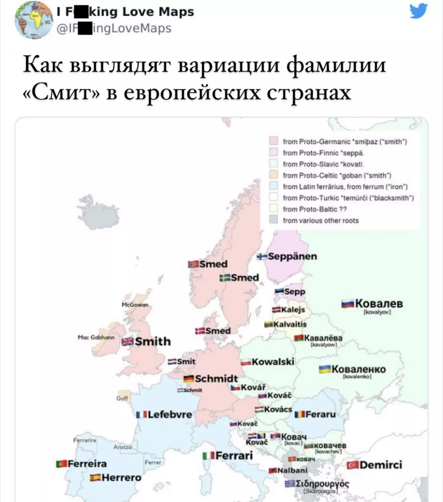 В России самая распространенная фамилия — Иванов, а вот Смит в нашем эквиваленте звучит как Ковалев (или Кузнецов).