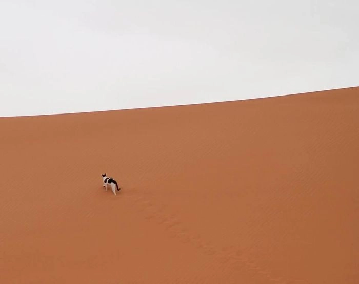 «Последний, кого я ожидала увидеть в пустыне Сахара, — этот черно-белый котейка»