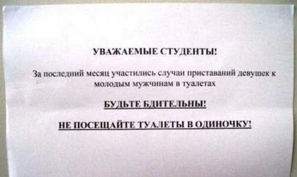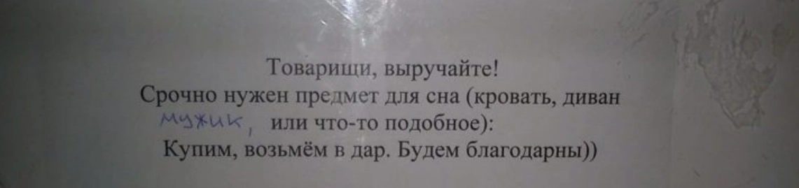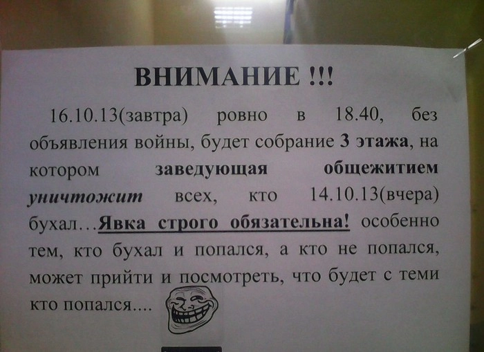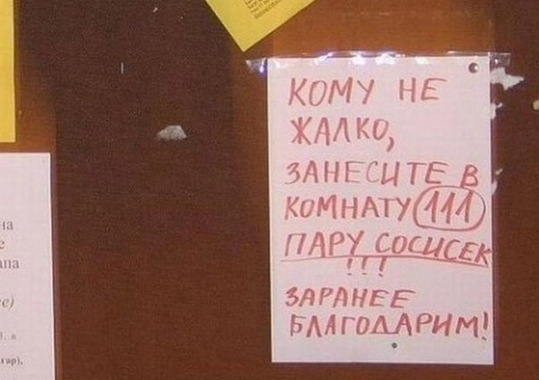 Любой студент, который во время учебы жил в общежитии, подтвердит, что это время было поистине незабываемым. Громкие соседи, постоянно занятый душ, пропадающая посуда и четырехчасовой сон — это лишь часть прелестей общажной жизни. Однако несмотря на все минусы, положительных воспоминаний было гораздо больше. И смешные объявления из нашей подборки готовы погрузить вас в атмосферу студенческих лет.