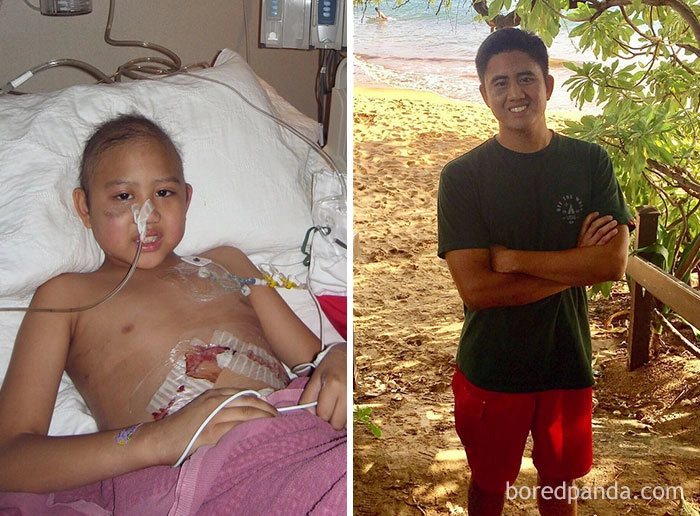 10. «14 циклов химиотерапии, 30 облучений и 4 операции. Мой маленький мальчик вылечился от рака и чувствует себя хорошо. На фото он после его последней операции и сейчас»